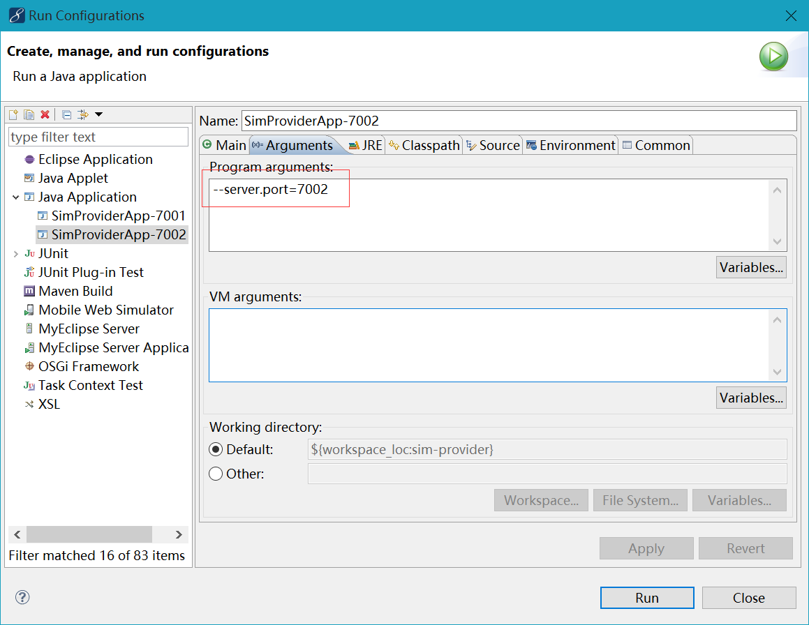 运行7002的实例,在eclipse中,右键run AS -- configure 在运行程序时添加一个程序参数 --server.port=7002 ,或者添加VM参数-Dserver.port=7002 即可。