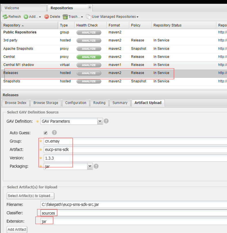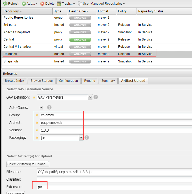 1、上传jar包到nexus私服 ,选择releases仓库,找到artifact upload 选项卡,填写GAV ,上传即可。