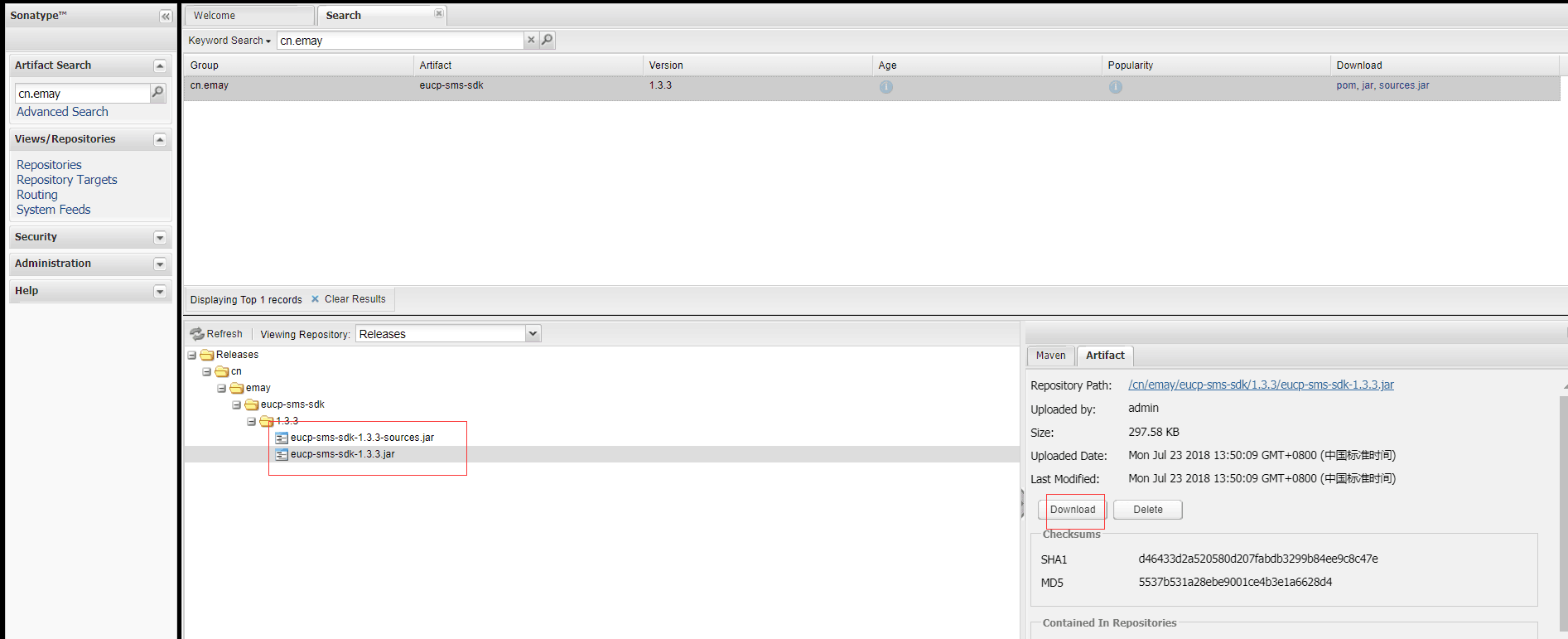 搜索、找到我们刚上传的 eucp-sms-sdk-1.3.3.jar 和eucp-sms-sdk-1.3.3-sources.jar ,点击download即可下载。