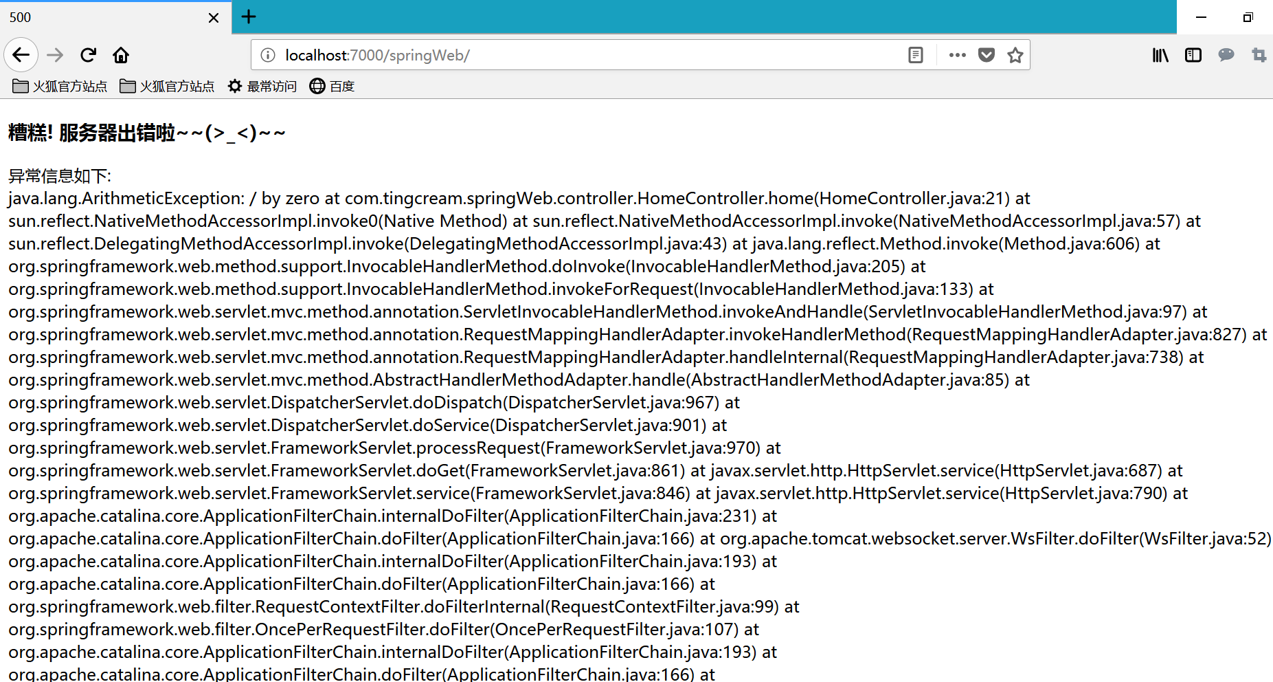用浏览器访问首页,发现报错了,进入了500.jsp页面 。