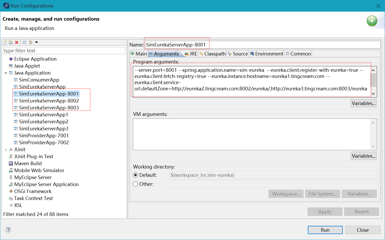 --server.port=8001 --spring.application.name=sim-eureka --eureka.client.register-with-eureka=true --eureka.client.fetch-registry=true --eureka.instance.hostname=eureka1.tingcream.com --eureka.client.service-url.defaultZone=http://eureka2.tingcream.com:8002/eureka/,http://eureka3.tingcream.com:8003/eureka/