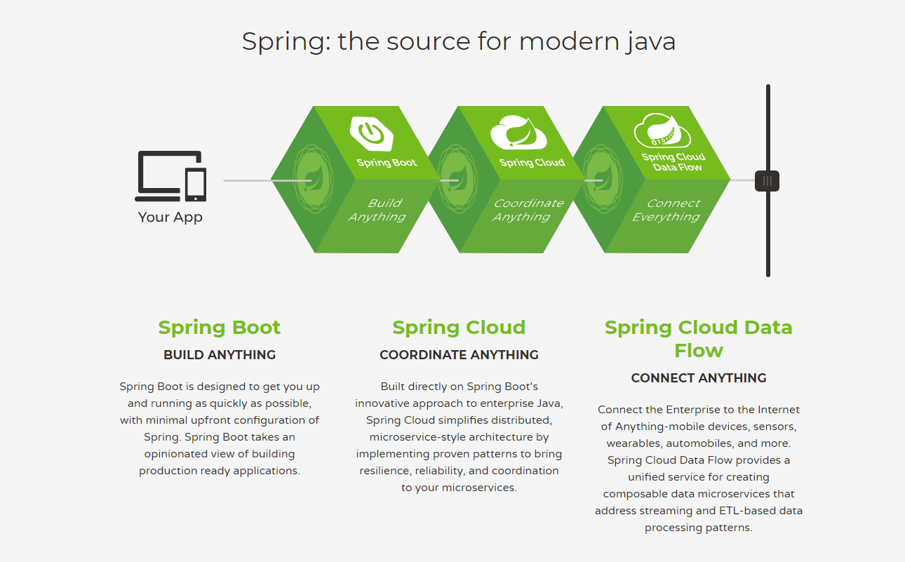 可以看到,spring官网(除了spring framework5)现在主推的就是springboot (快速开发单体spring应用)、spring cloud (spring微服务的集大成者)以及spring data flow (数据流处理)等。