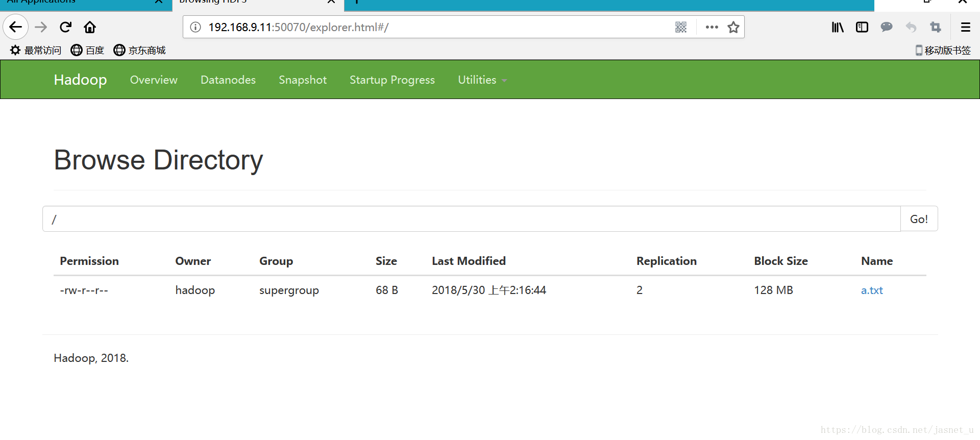 hadoop fs -put a.txt / 测试上传一个文件到hdfs根路径上