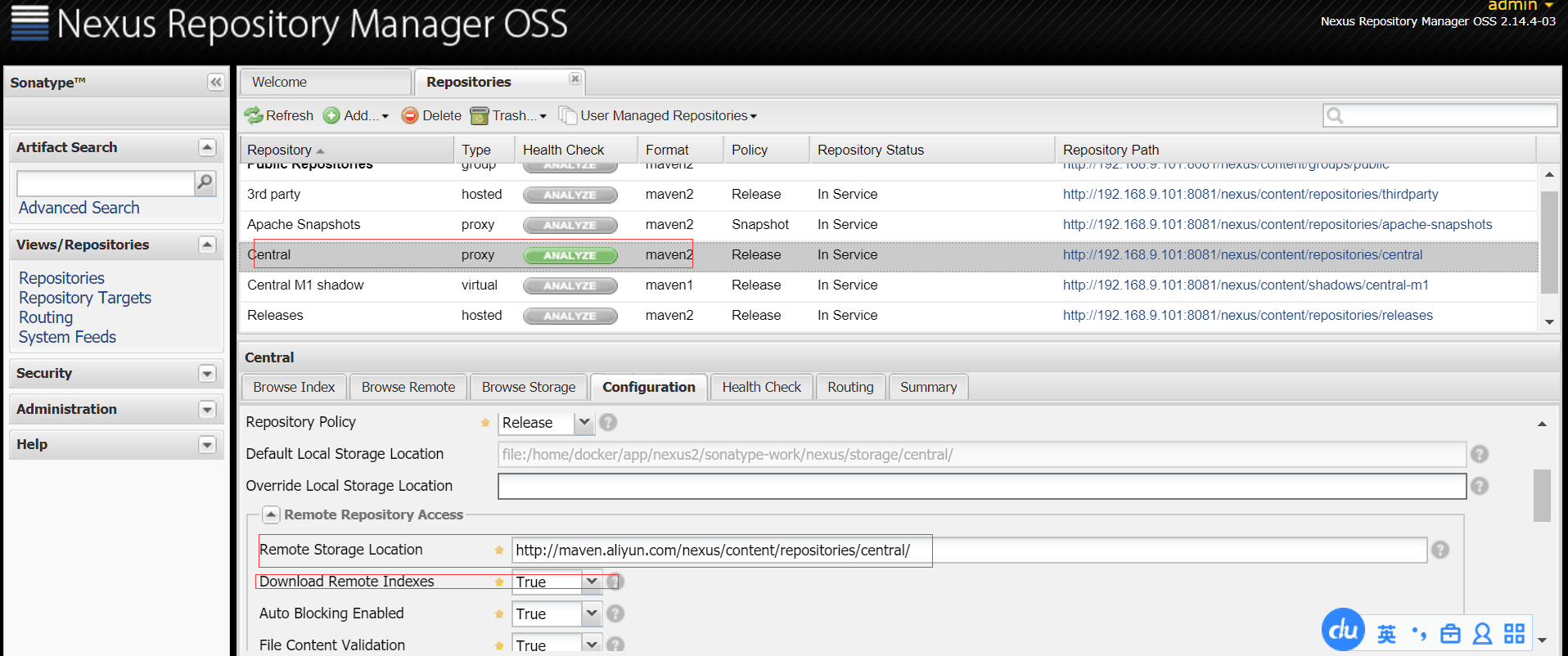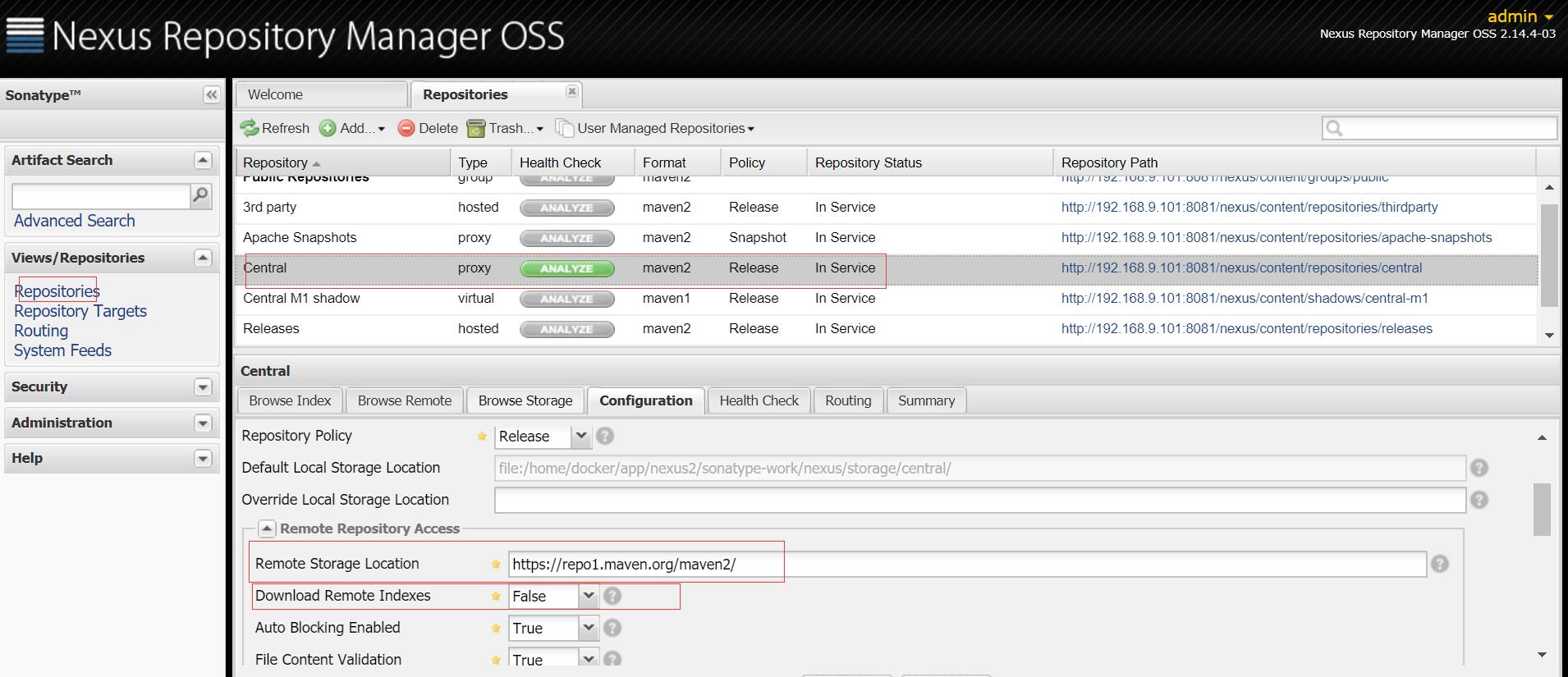 我们需要将emote storage location 值改为:http://maven.aliyun.com/nexus/content/repositories/central/ ,Download Remote Indexes 值改为True.