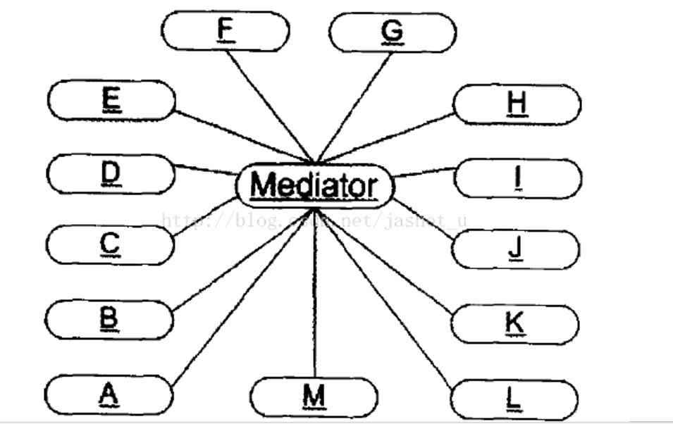 通过引入调停者(Mediator),可以将系统的网状结构变为以中介为中心的星形结构。