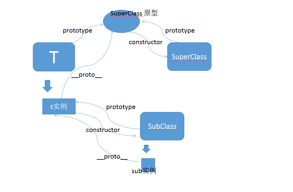 注:此时t实例即称为了SubClass的原型对象,达到了SubClass类原型继承SuperClass的目的。