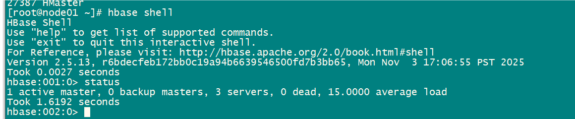 其中node01上运行了HMaster 、HRegionServer 的java进程,jps可以查看