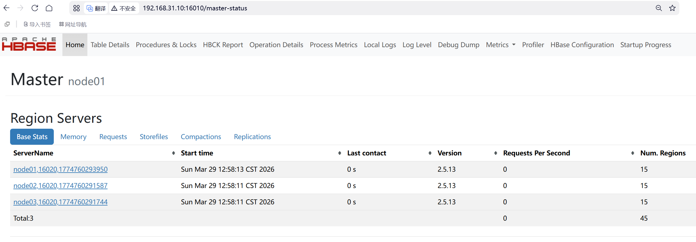 浏览器访问http://192.168.31.10:16010/master-status ,看到有3个region server说明hbase的3节点集群启动成功了。